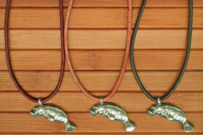 Black leather cord necklace with pewter manatee pendant.