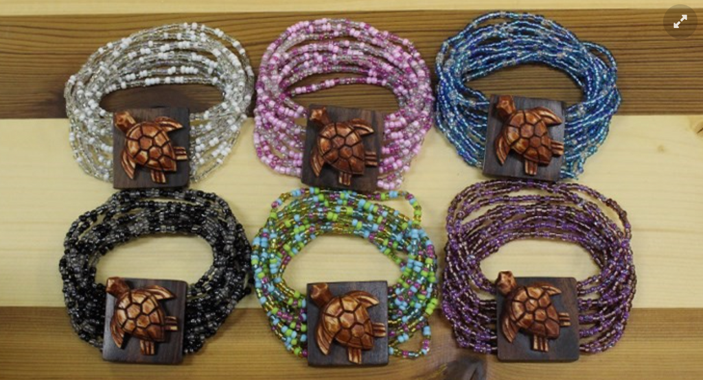 Big, chunky beaded stretch bracelet with carved sea turtle.
